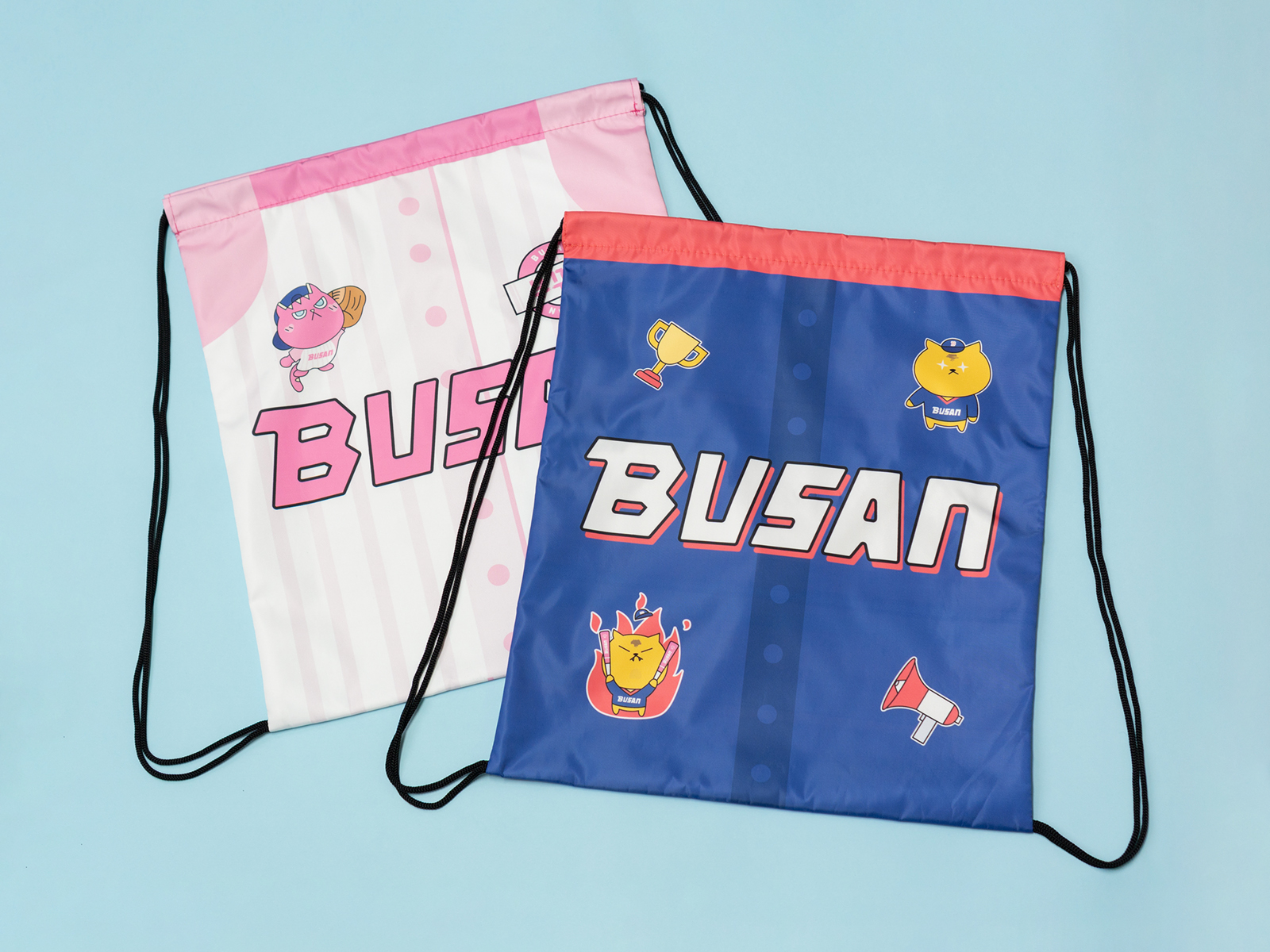 부산의 야구 열기와 귀여운 감성을 동시에 담아낸 부산냥즈! 부산냥즈의 귀여움을 폴리 짐색 스트링 백팩 세트에 담았습니다. 폴리 짐색이라고도 불리는 스트링 백팩은 스트링을 당기기만 하면 수납이 가능한 아이템이랍니다. 상단의 끈을 당기면 복조리 형태로 조여져요. DTP 전체 승화인쇄로 깔끔하게 그래픽을 연출하였어요.