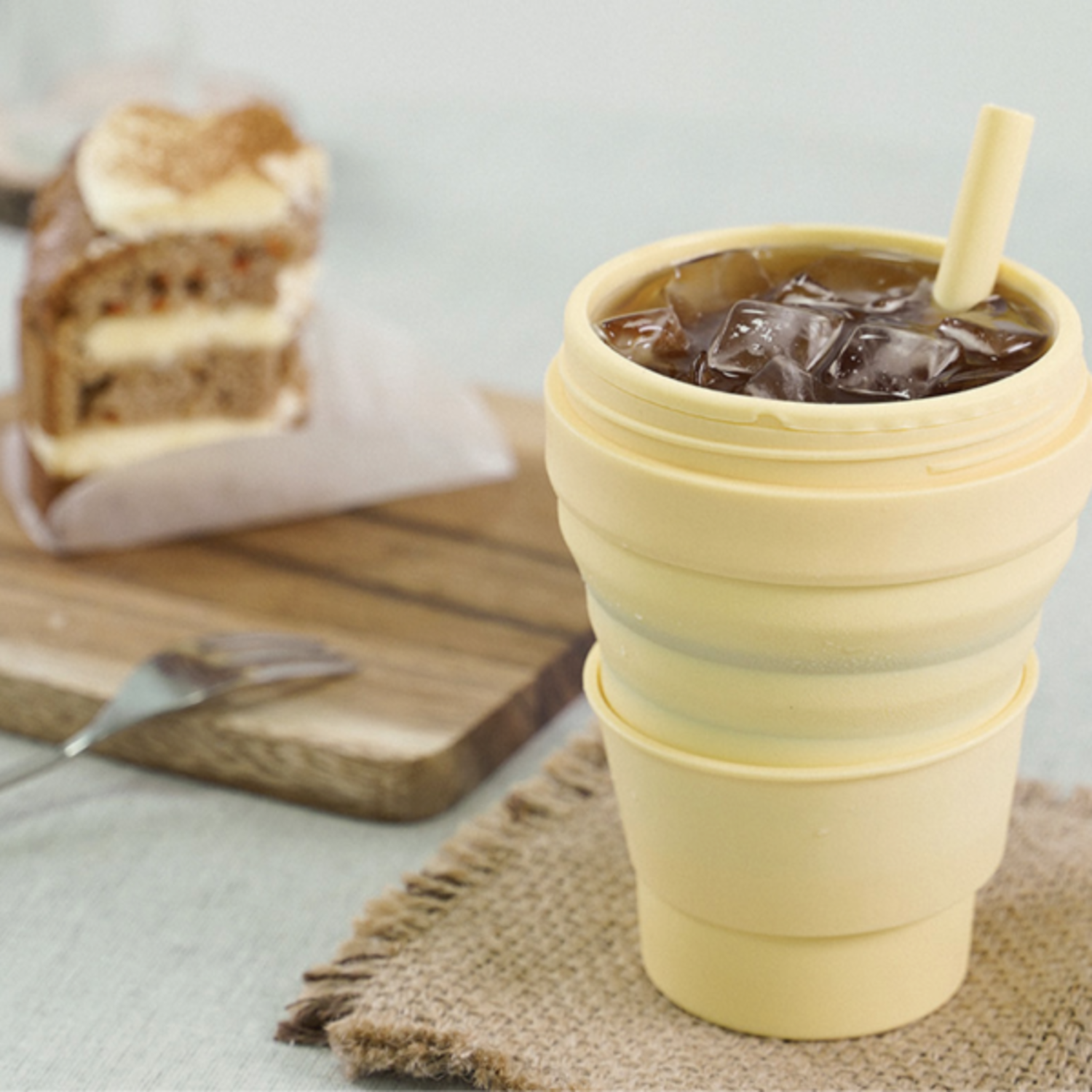 친환경 소재의 접이식 텀블러에요 내열성 실리콘 소재로 냉,온 음료도 담을 수 있어요