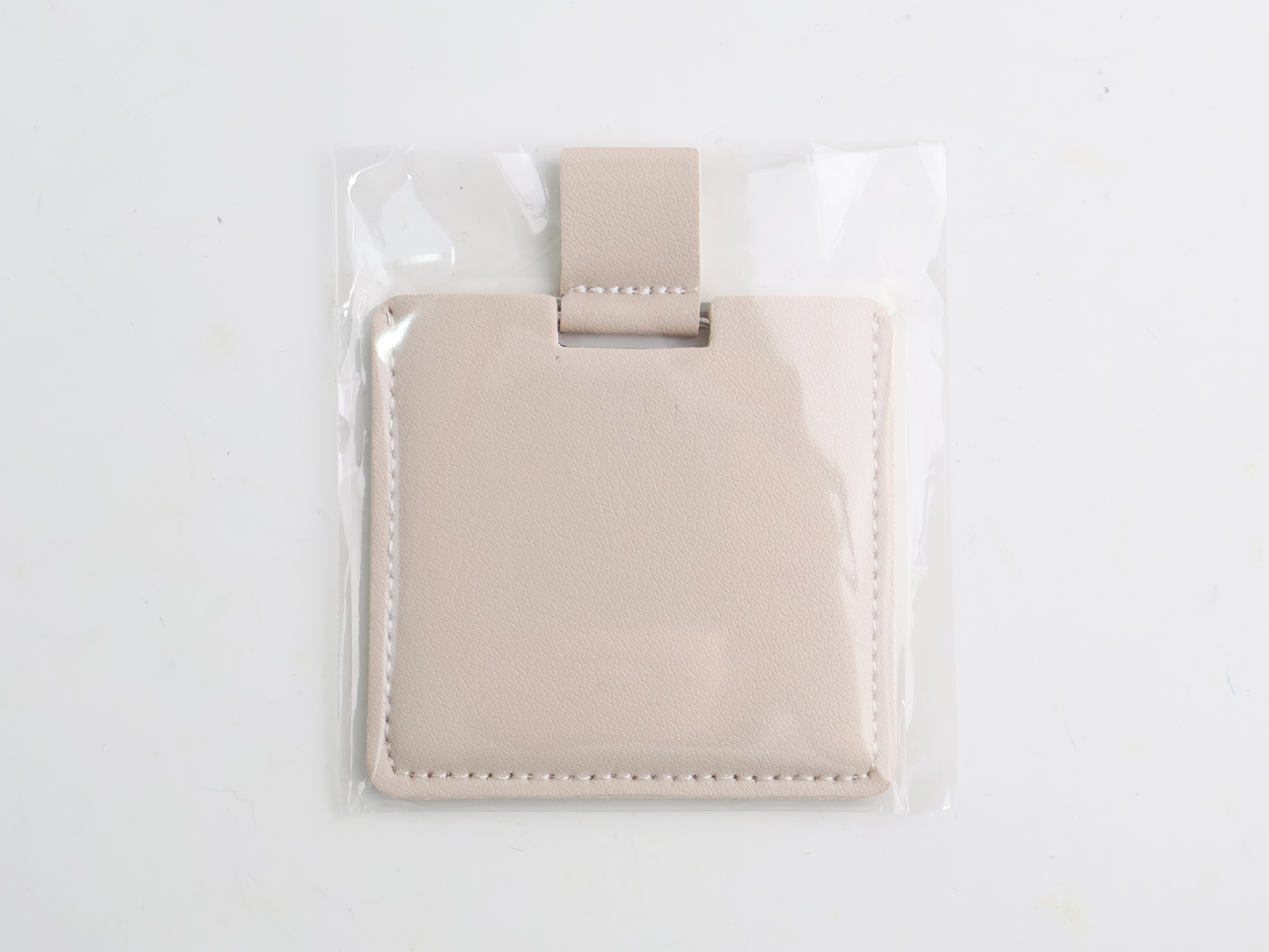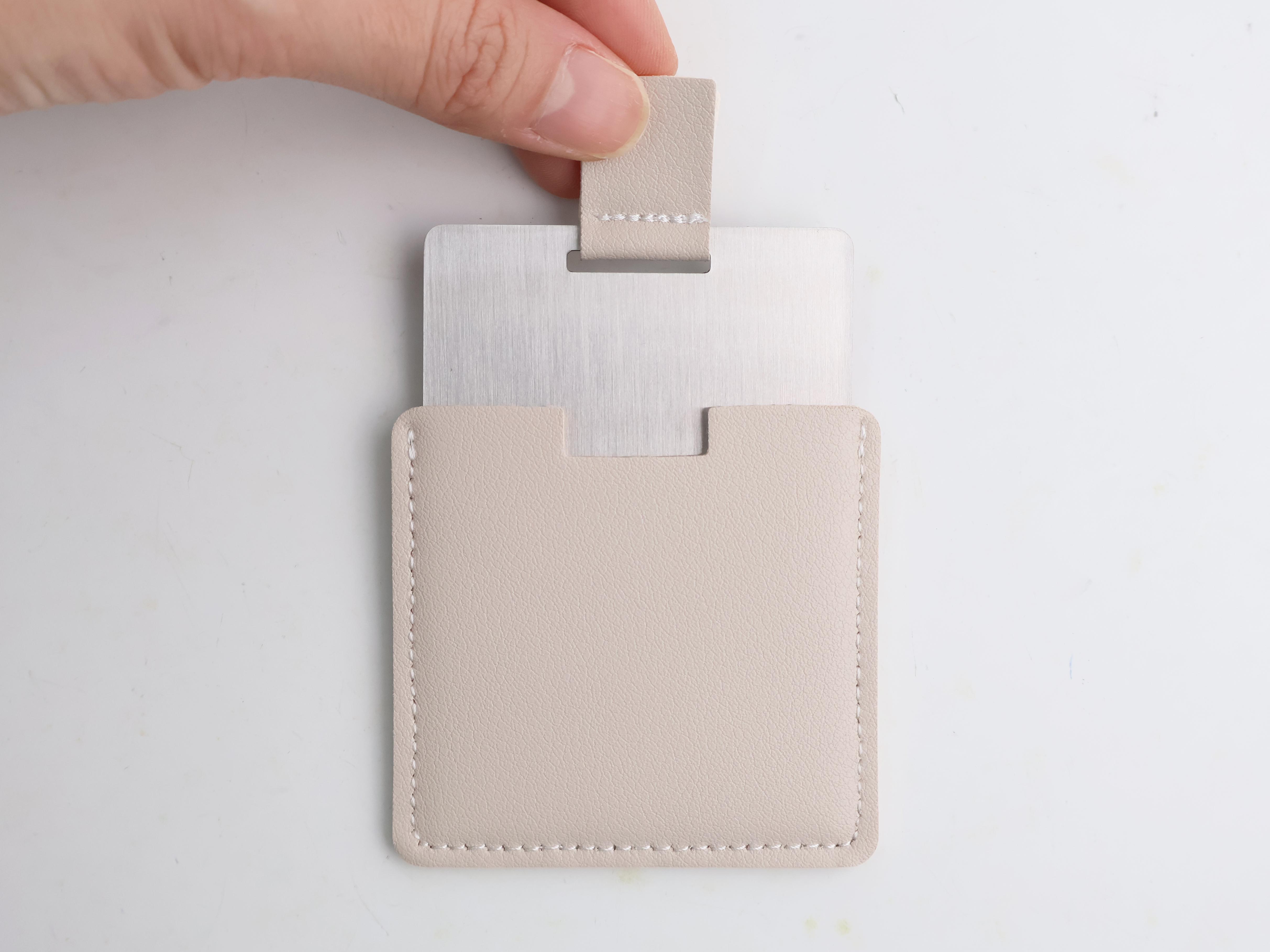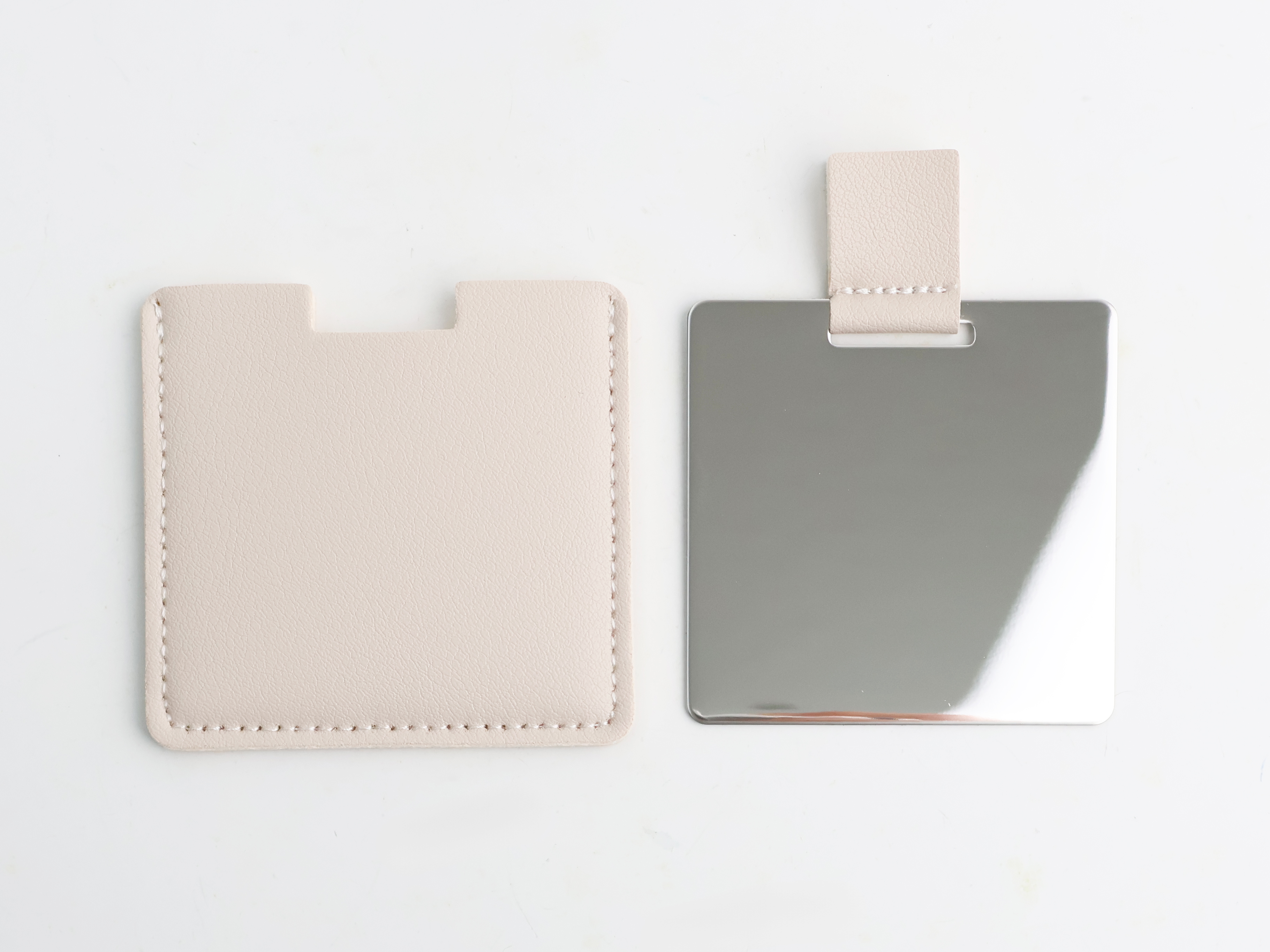 감각적인 디자인의 인조가죽 케이스와 거울 후면에 레이저 인쇄가 가능한 미니 사각 손거울이에요