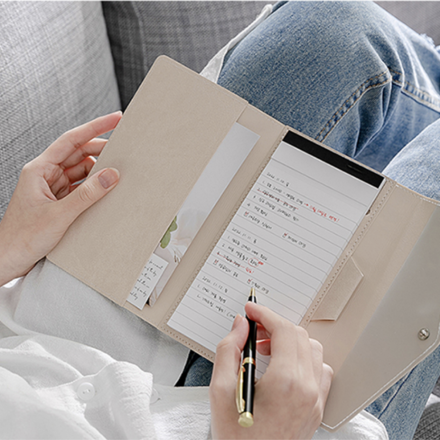 가죽느낌의 부드러운 촉감을 가진 케이스로 다양한 수납까지 가능하여 실용성이 높은 메모패드에요