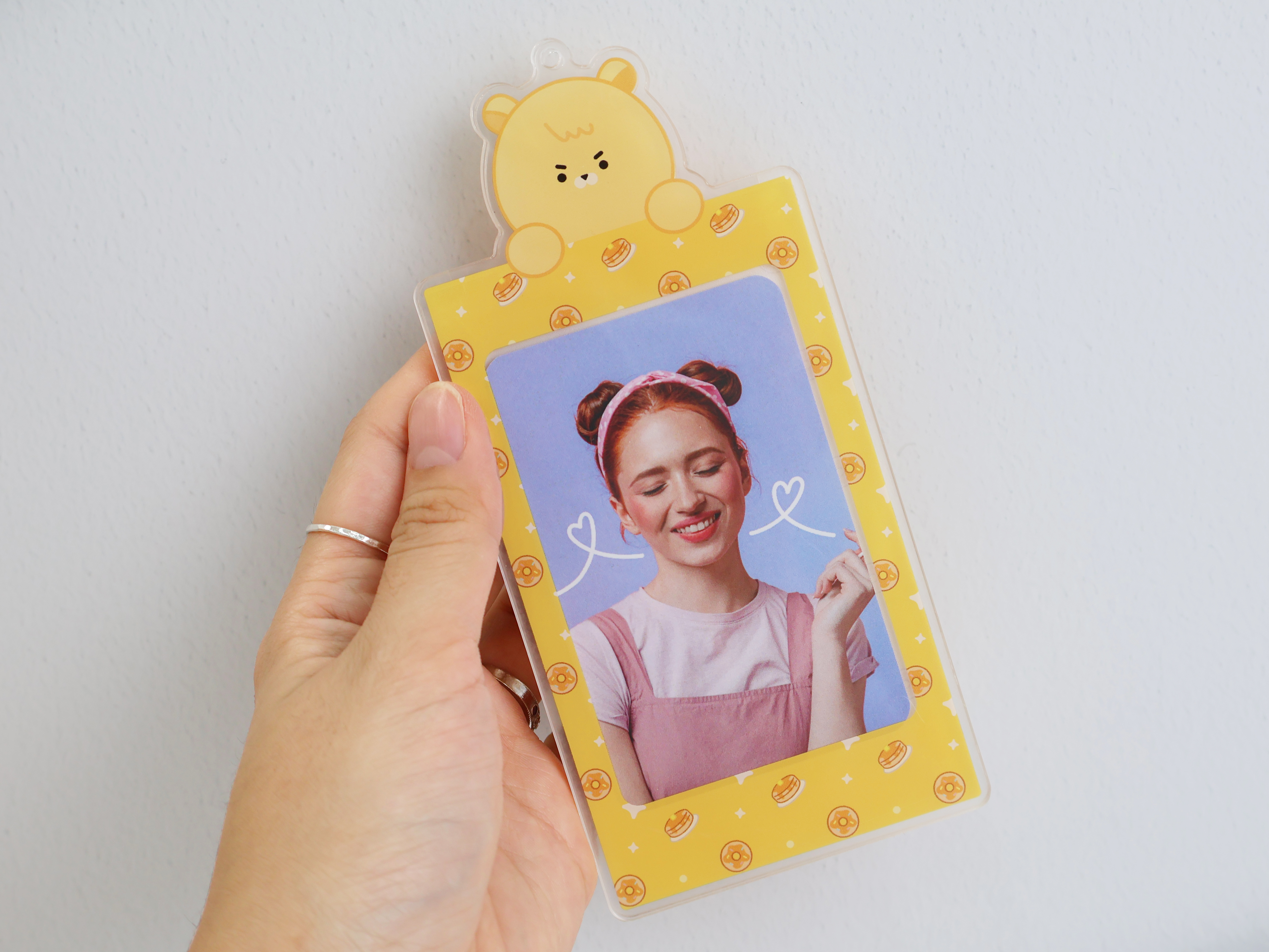 아크릴 소재로 제작하여 가볍고, 최애 포카를 보관과 동시에 보호할 수 있는 아크릴 포카 홀더 키링이에요