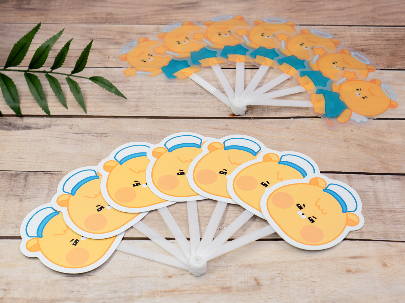 그림을 인쇄한 PP판 뒷면에 부채 자루를 붙이는 형태로 제작해요
