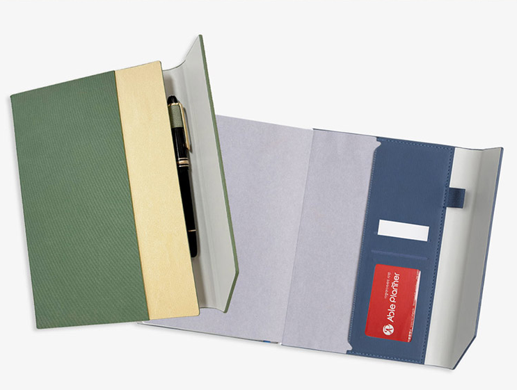 카드와 영수증, 펜 등을 꽂을 수 있게 커버가 제작된 다이어리예요
